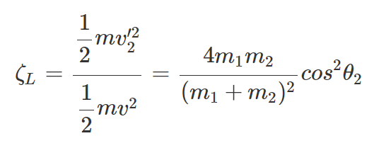질량이 m_1인 입자가 질량이 m_2이고 정지 상태인 입자에 충돌하는 경우, 에너지 전달률은 다음과 같다.