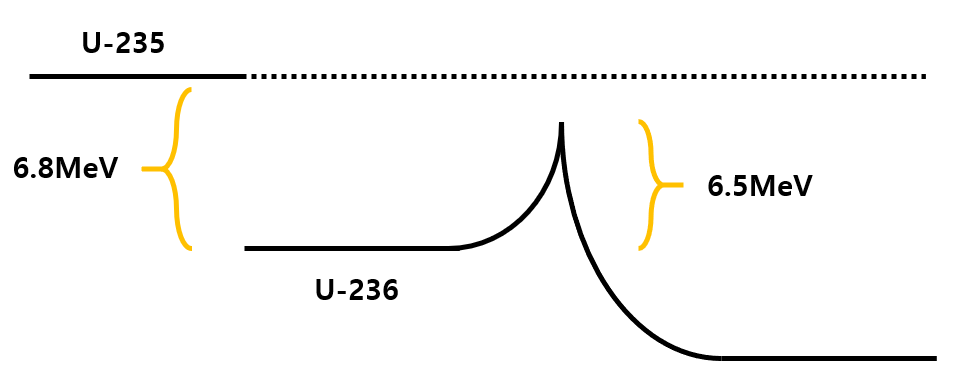 위 그림은 에너지가 없는 중성자가 U-235에 포획되어 U-236이 되는 과정을 나타낸 것이다. 중성자가 가져오는 에너지가 없으므로, 복합핵이 가진 에너지는 U-235에서 U-236으로 변할 때 생긴 바닥 상태 에너지 준위의 낙차 6.8MeV가 전부이다. 그런데 이 에너지만으로도 critical energy 6.5MeV를 뛰어넘을 수 있기 때문에, fission이 발생할 수 있다. 이처럼 중성자의 에너지에 관계 없이 분열이 가능한 물질을 fissile이라 한다. 그렇지 않고 어느 정도의 에너지를 얻어야만 분열이 되는 물질을 fissionable 또는 fertile이라 한다.