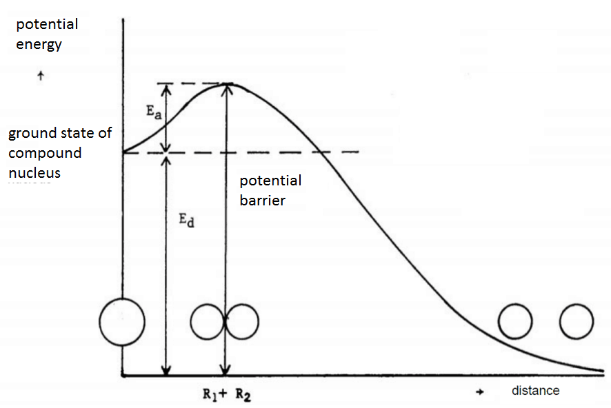 위 그림을 보면 퍼텐셜의 기울기가 바뀌는 지점의 distance가 R_1+R_2로 쓰여 있는데, 이것은 복합핵이 fission product 2개로 분리되는 정확한 시점을 의미한다. 그래프의 E_a가 critical energy이고, E_d는 전자기 퍼텐셜 에너지에서 E_a를 뺀 것으로 분열 전후의 질량 차를 에너지로 환산한 값과 같다.
