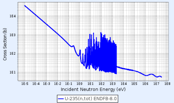 중성자에 의한 핵분열 반응은 중성자가 가진 에너지 영역대에 따라 cross section의 그래프 형태가 달라진다. 다음은 실험적으로 얻어낸 U-235의 total cross section을 나타낸 것이다. y축의 cross section 단위는 b라 써 있는데, 1e-24 cm^2을 1 barn이라 하여 cross section을 표현하는 대표적인 단위로 사용된다.