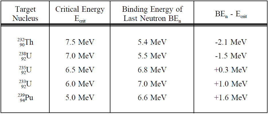 위 표는 대상 핵의 critical energy와 binding energy를 나타낸 것이다. 일반적으로 질량수가 짝수인 핵이 홀수인 핵보다 안정적이므로, 복합핵의 질량수가 짝수가 되는 경우 에너지 준위의 낙차가 크다. 따라서 질량수가 홀수인 대상 핵이 주로 fissile에 해당하며 대표적인 예시가 U-235이다. 반대로 질량수가 짝수인 U-238은 fertile에 속한다.