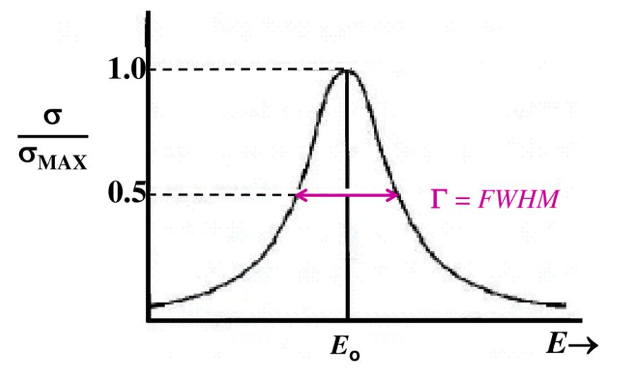 일반적으로 에너지 준위는 이산적으로 분포한다(Schrödinger equation의 해에 의해). 그런데 Dirac의 불확정성 원리에 의해, 해당 에너지에서 바닥 상태로 내려가는 데 걸리는 시간에 반비례하는 폭만큼 에너지 준위가 분산되는데 이것이 resonance가 폭을 갖는 이유이다.