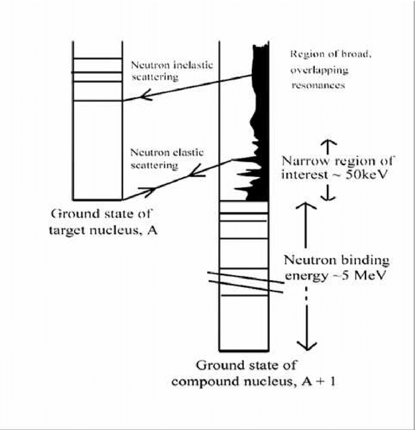 Fig 1의 오른쪽 그림을 보면 에너지 준위 상단부에 resonance가 여럿 발생한 것을 확인할 수 있다. binding energy와 neutron energy를 합친 값이 특정 에너지에 근접하면 이에 해당하는 핵반응이 일어날 확률이 대폭 증가하는데, 이를 resonance라 한다. E_B와 E_C의 합이 복합핵의 에너지 준위 중 하나에 도달하면 compound nucleus가 만들어질 발생 확률이 증가한다.