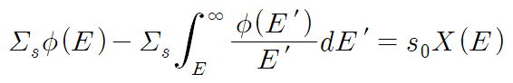 임의의 에너지 E에 대해, 총 생성량과 손실량은 항상 같다. fission으로 만들어진 중성자가 해당 에너지 E를 가지는 경우, 그리고 E < E'인 에너지 E'에서 scattering에 의해 에너지가 E로 감소하는 경우가 생성에 해당한다. 손실은 에너지 E에서의 반응률로 계산할 수 있다. 반응률의 단위에 맞춰 단위부피당, 단위시간당 전체 에너지 범위에서 생성되는 중성자의 수를 s_0라 두자. 그러면 식을 다음처럼 쓸 수 있다.