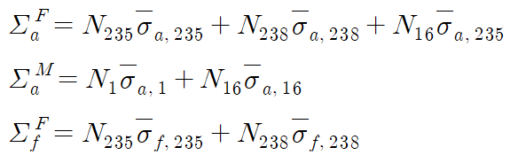 앞 문단에서 썼던 가중평균을 사용해 표현하면 다음과 같다. thermal, epithermal, fast 영역의 번호를 각각 1, 2, 3으로 쓰고, 핵연료는 U-235와 U-238, 그리고 O로 이루어져 있으며 감속재는 물(경수)로 설정하자. 각 원소를 의미하는 우하첨자는 질량수로 표기하였다. O는 absorption에는 관여하나 fission에는 관여하지 않는 것에 유의하자.