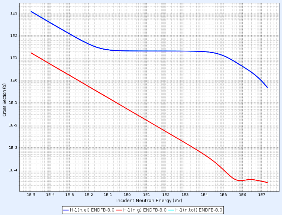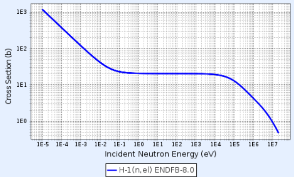 위 그래프는 수소의 (elastic) scattering cross section을 나타낸 것이다. 대략 0.1eV ~ 1e+4eV 구간에 걸쳐 cross section이 거의 일정한 값을 가지는 것을 알 수 있는데, 이를 참고하여 일전의 식에서 scattering cross section을 E'에 독립적인 상수로 가정하자.