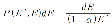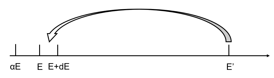 마지막으로 이전 글(seraphy.tistory.com/15)에서 언급된 바에 따르면 scattering에 의해 에너지가 감소하는 과정을 다음 그림처럼 나타낼 수 있다. 임의의 에너지 E'에서 최소 에너지 αE' 사이의 구간 [E, E+dE]로 진입하는 것을 의미한다.