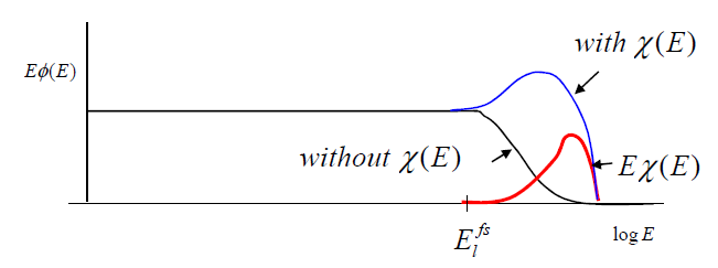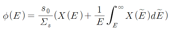 우하첨자는 total과 scattering을 의미하고, P(E', E)는 에너지 E'에서 E로 scattering될 확률을 뜻한다. X(E)는 전체 핵분열 중성자 중 에너지가 E인 비율을 나타낸다.