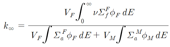 무한증배계수를 식으로 쓰면 다음과 같다. V는 부피, 첨자 F는 fuel, M은 moderator를 의미하며 f와 a는 각각 fission과 absorption의 약자이다. ν는 반응당 생성되는 중성자의 수를 뜻한다. Absorption은 fuel과 moderator 모두에서 일어나지만 fission은 fuel에서만 발생하는 것에 유의할 것.
