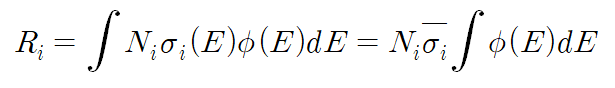 이때 미소에너지가 곱해진 값 Φ(E)dE가 flux의 단위를 갖고, 반응률은 macroscopic cross section과 flux를 곱한 뒤 적분하여 다음처럼 계산한다. i는 혼합물 내의 여러 원소들에 번호를 부여한 것이다.