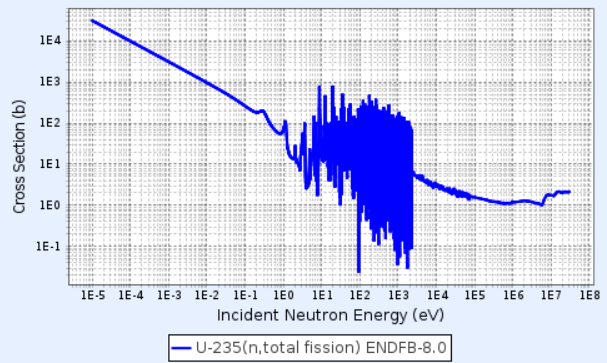이전 글(seraphy.tistory.com/15)에서 중성자의 충돌과 그로 인한 에너지 손실을 설명하던 중 감속재(moderator)에 대해 짧막하게 언급한 바 있다. 감속재는 말그대로 중성자의 속도를 줄여주는 역할을 하는데, 그 이유는 핵연료인 U-235의 fission cross section이 중성자 에너지가 낮은 영역에서 높게 나타나기 때문이다. 이처럼 저에너지의 중성자를 열중성자(thermal neutron)라 부르고, 반대로 고에너지의 중성자는 속중성자(fast neutron)라 한다.