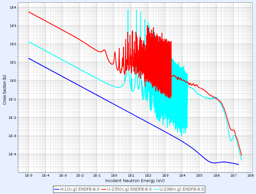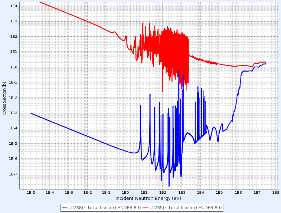 U-235의 속중성자에 대한 fission cross section은 열중성자에 대한 값보다 훨씬 작지만, 고에너지 영역에서 U-238의 fission cross section이 크게 증가하기 때문에 fission으로 생성된 속중성자가 다시 fission을 일으킬 수 있다. 앞선 그래프에서 확인되는 U-238의 cross section은 충분하지 않은 것으로 보이겠지만, 전체 핵연료에서 U-238이 차지하는 비중이 235에 비해 훨씬 높다는 것을 감안하자.