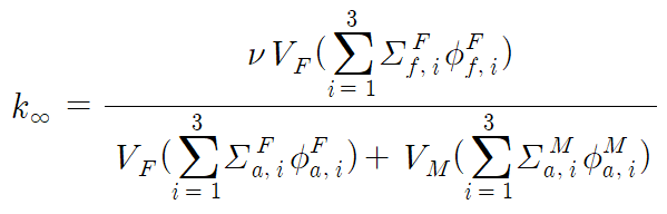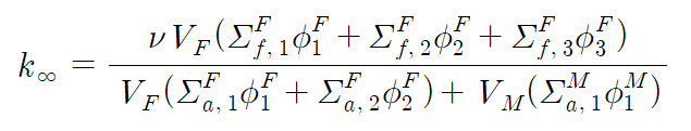 무한증배계수는 증배계수를 계산할 때 cell의 부피가 무한대라고 가정하고 구한 값을 말한다. 이러한 가정을 통해 클래딩의 부피와 중성자의 누설을 무시할 수 있다. Cell 내부의 fuel에서는 fission과 absorption이 발생하고, moderator에서는 absorption만 발생한다.