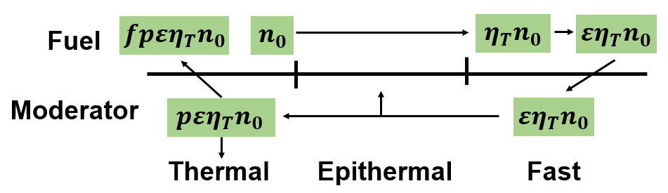 원자로 내의 중성자는 한 세대 동안 여러 단계를 거치는데, 이에 맞춰 무한증배계수는 각 과정에 해당하는 더 작은 계수들의 곱으로 구성되어 있다. 하나의 중성자가 한 세대 동안 지나는 단계들을 살펴보면서 무한증배계수가 어떻게 계산되는지 알아보자.