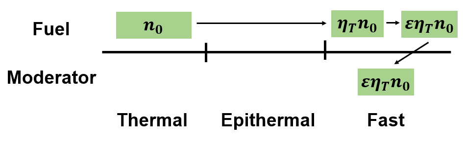 이처럼 고에너지 영역에서 발생하는 fission으로 인한 증가율을 fast fission factor(속분열인자)라 하고 ε로 표기한다. 모든 fission이 끝나면 중성자는 moderator로 이동하고, 그림으로 나타내면 다음과 같다.