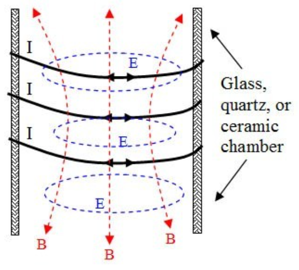 ICP 장치는 원통형 chamber 주위로 도선이 감긴 형태로 구성되어 있다. 코일에 교류 전류가 흐르면 이로부터 변화하는 자기장이 생기고, 이는 다시 회전하는 전기장을 만든다. 이 전기장으로 전자를 가속시켜 플라즈마를 생성한다.