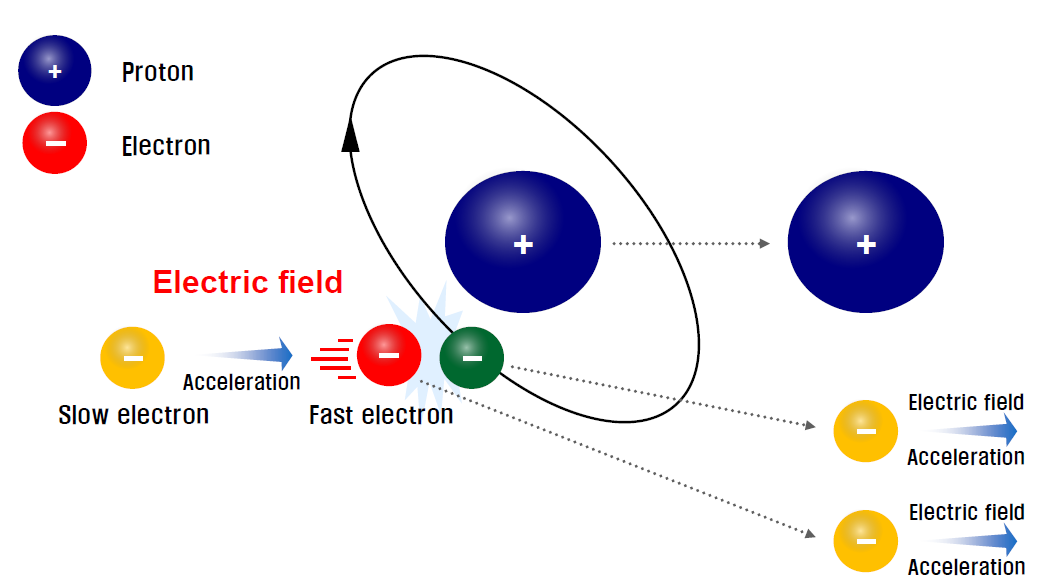 전자가 원자를 이온화하기 위해서는 전기장으로부터 얻은 에너지가 이온화에너지를 넘어서야 한다. 이로부터