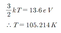 지난 글(seraphy.tistory.com/2)에서 살펴보았듯이, 플라즈마란 간단히 말해 원자핵과 전자가 분리된 상태를 말한다. 이러한 상태를 만들어주는 방법에는 여러 가지가 있는데, 기본적으로 떠올릴 수 있는 방안은 온도를 높여 그 열에너지를 사용해 원자로부터 전자를 떼어내는 것이다. 수소 원자의 이온화에너지는 13.6eV이므로, 열을 이용한 이온화가 가능한 최저의 온도를 계산하면 다음을 얻는다.