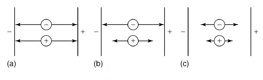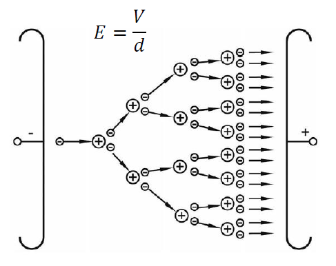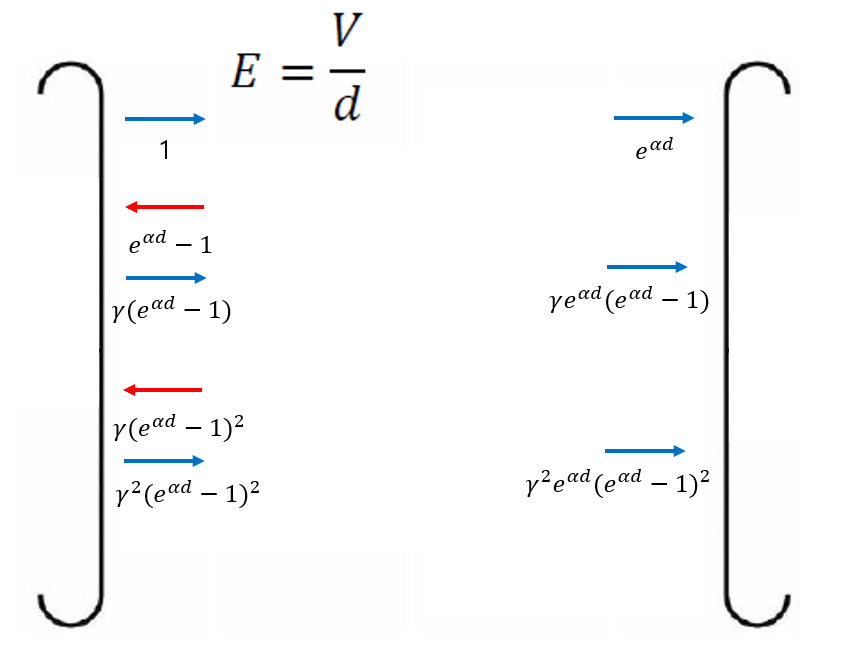 일정 전압 이상을 걸어주면, 음극에서 출발한 전자는 진행 경로 위에 있는 원자들과 충돌하며 전자를 생성한다. 이러한 증배계수를 생각해보면, 전체 전자의 수에 대해서 다음처럼 식을 쓸 수 있다.