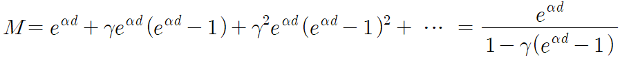 위 그림은 한 개의 전자가 이온과 전자를 증식시키는 과정 중 일부를 나타낸 것이다. 붉은색 화살표가 이온, 푸른색 화살표가 전자에 해당한다. 음극에서 양극으로 갈 때는 전자가 exp(alpha x d)배로 증가하고, 여기에서 생성된 이온(양극에 도달한 전자 수에서 이를 유발한 전자 수를 빼주어야 한다)이 그 수의 gamma배에 해당하는 전자를 만들게 되며 다시 이들이 exp(alpha x d)배 증가하는 과정이 반복된다. 이때 양극에 도달하여 전류로 측정되는 전자의 수는 무한급수 공식을 사용해 계산할 수 있다. 이것은 1개의 전자에서 비롯된 것이므로, 수정된 증배계수와 같다.