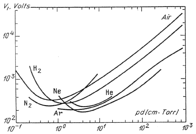 이렇게 구한 전압 식에서 A와 B는 기체의 특성에 의해 결정되는 값이다. 따라서 자발 방전이 일어날 수 있는 전압은 방전판 사이의 거리와 기체 압력의 곱 pd에 대한 함수로 쓸 수 있다. 이를 그래프로 나타낸 것을 Paschen curve라 한다.