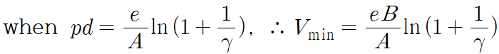 우리가 원하는 것은 자발 방전을 일으켜 플라즈마를 발생시킬 수 있는 최소한의 전압이다. 위에서 얻은 전압에 대한 식 V = f(pd)를 미분하여 그 최솟값을 찾으면 다음을 얻는다.