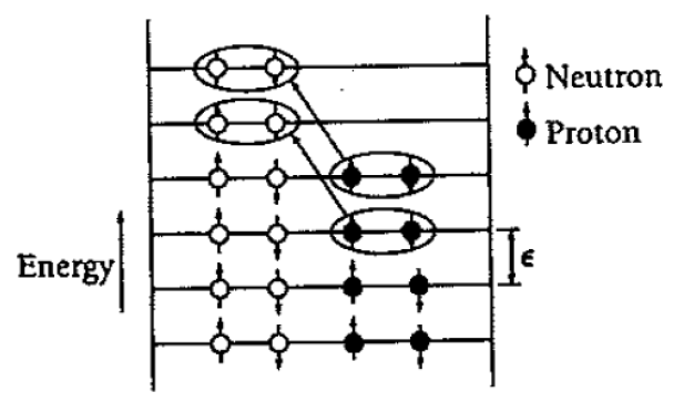 배타 원리(exclusion principle)에 의해 핵 내부의 에너지 준위는 각각 양성자 pair 하나와 중성자 pair 하나로 완전히 차게 된다. 즉 4개의 핵자 nnpp가 하나의 에너지 준위를 차지하는 것이다. 이 때문에 핵 내부의 중성자가 양성자보다 많아지면(원자번호가 커지면 이런 경향이 나타난다) 중성자들은 비어있는 양성자 자리로 들어가지 않고 더 높은 에너지 준위의 중성자 자리에 들어가며, 핵의 불안정성이 증가하는 결과를 가져온다.