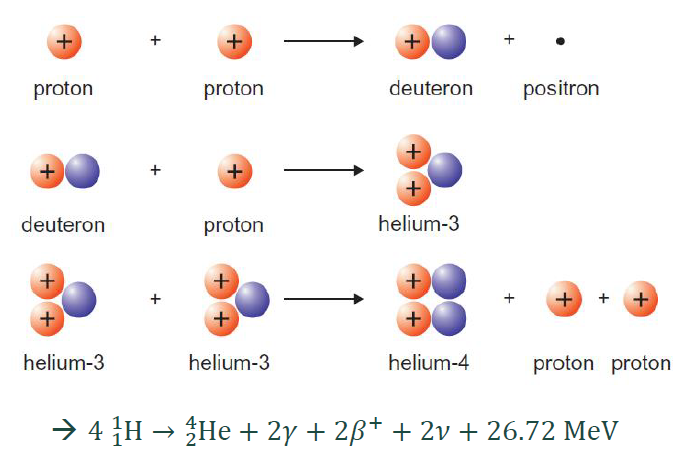 흔히 핵융합을 논할 때 예시로 드는 것 중 하나가 태양이다. 태양은 항성 내부의 수소가 헬륨으로 변하는 핵융합 반응을 통해 막대한 에너지를 얻는다. 대표적인 반응은 양성자(수소 원자핵) 4개가 모여 헬륨 1개를 만드는 반응이다.