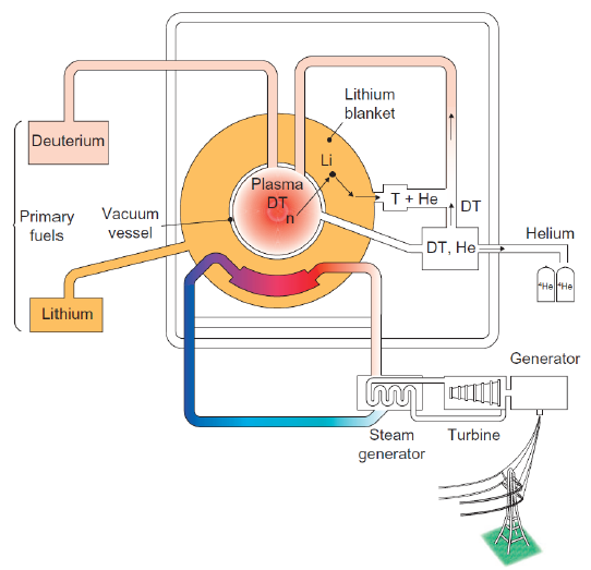 이때 DT 반응식을 다시 보자. DT 반응으로 생성되는 물질 중에 중성자가 있음을 알 수 있다. 따라서 핵융합로의 설계는 DT 반응에서 얻은 중성자를 리튬에 입사시켜 T를 공급하는 계통을 포함하고 있다. 아래 그림은 플라즈마 상태의 DT가 반응하는 내부 핵융합로와 그 주위를 감싼 리튬 blanket, 잔여 물질인 헬륨을 처리하는 계통을 나타낸 것이다. 실제 발전은 이 과정에서 얻은 중성자의 에너지와 리튬 반응에서 방출된 에너지로 물을 가열해 터빈을 돌리는 기존 방식을 사용한다.