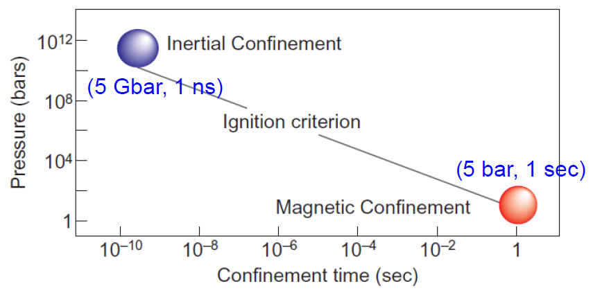 이는 다시 말해 5 bar의 기압에서 1초, 또는 5 Gbar에서 1ns 동안 플라즈마를 유지하면 ignition 조건을 만족한다는 뜻이다. 유지시간이 긴 전자는 자기장 가둠을 이용한 핵융합 방식이고, 시간이 짧은 후자는 관성 가둠을 사용한 핵융합 방식에 해당한다. 이러한 핵융합 방식에 대해서는 다음 글에서 다룬다.